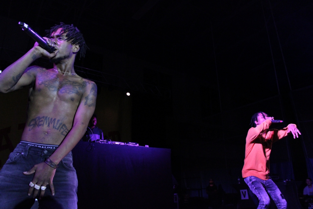 The little-brother, big-brother dynamic emerged when the two musicians built off one another’s dance moves on stage. A shirtless Slim Jimmi stayed front and center to show off his swaying moves while Swae Lee jumped up and down behind him. Swae Lee describes shows on college campuses as “a big party” where students can come get crazy. Even during his short water break between songs, lee jumped up and down backstage, ready to get back up. The only thing Lee said he dislikes about college campuses is all the rules.