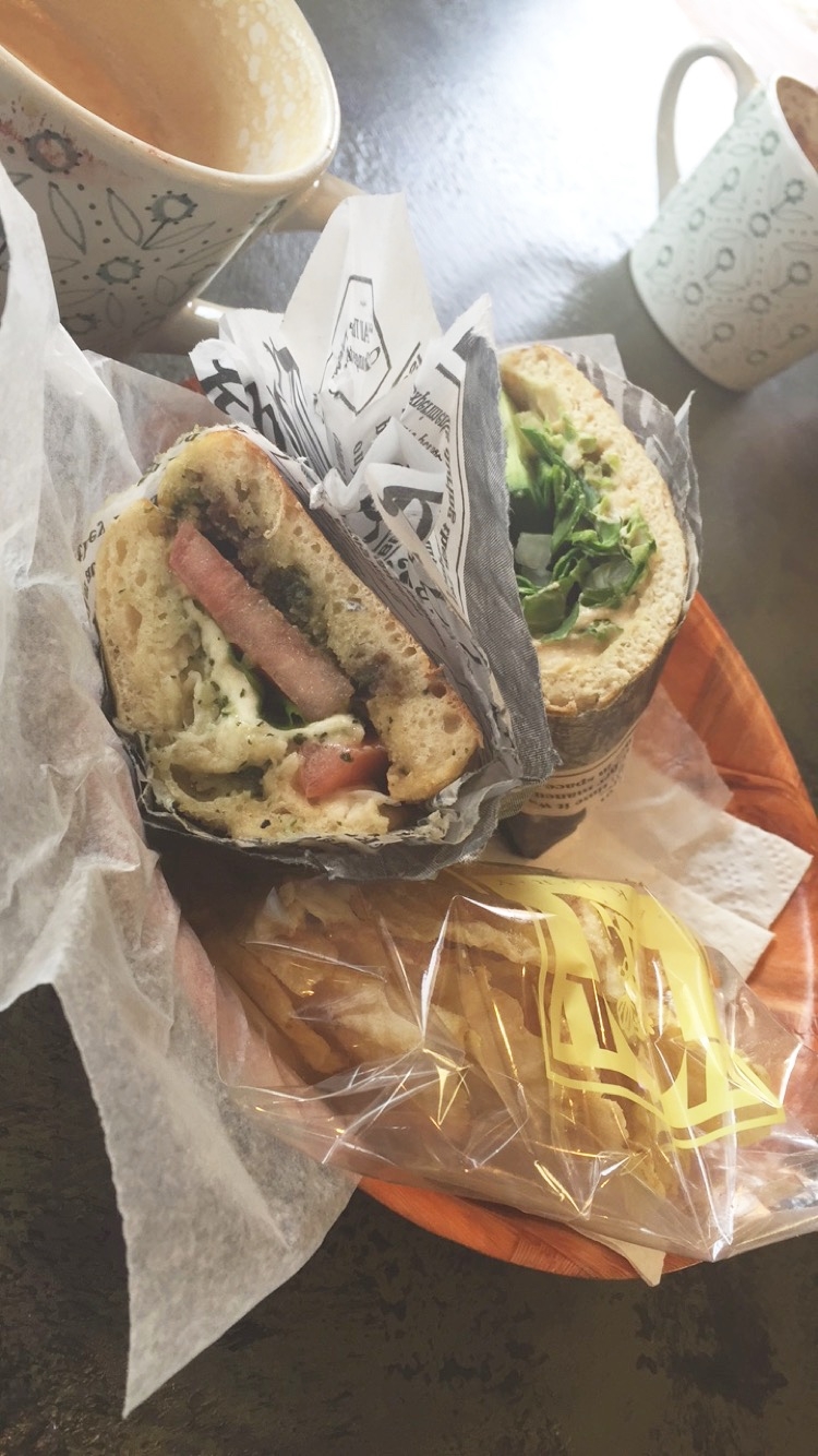 The interior of the coffee shop is very inviting, with details like chalkboards with sayings and menu specials written on them, comfy looking chairs and the friendly faces at the counter. Wine is whimsically displayed on the walls and the artwork and chalkboards are beautiful. The mix of regular wooden tables and chairs with upholstered arm chairs is chic. It's cute, quaint and provides free wi-fi. You can also sit outside under heated lamps on colder days or enjoy the breeze during summer.