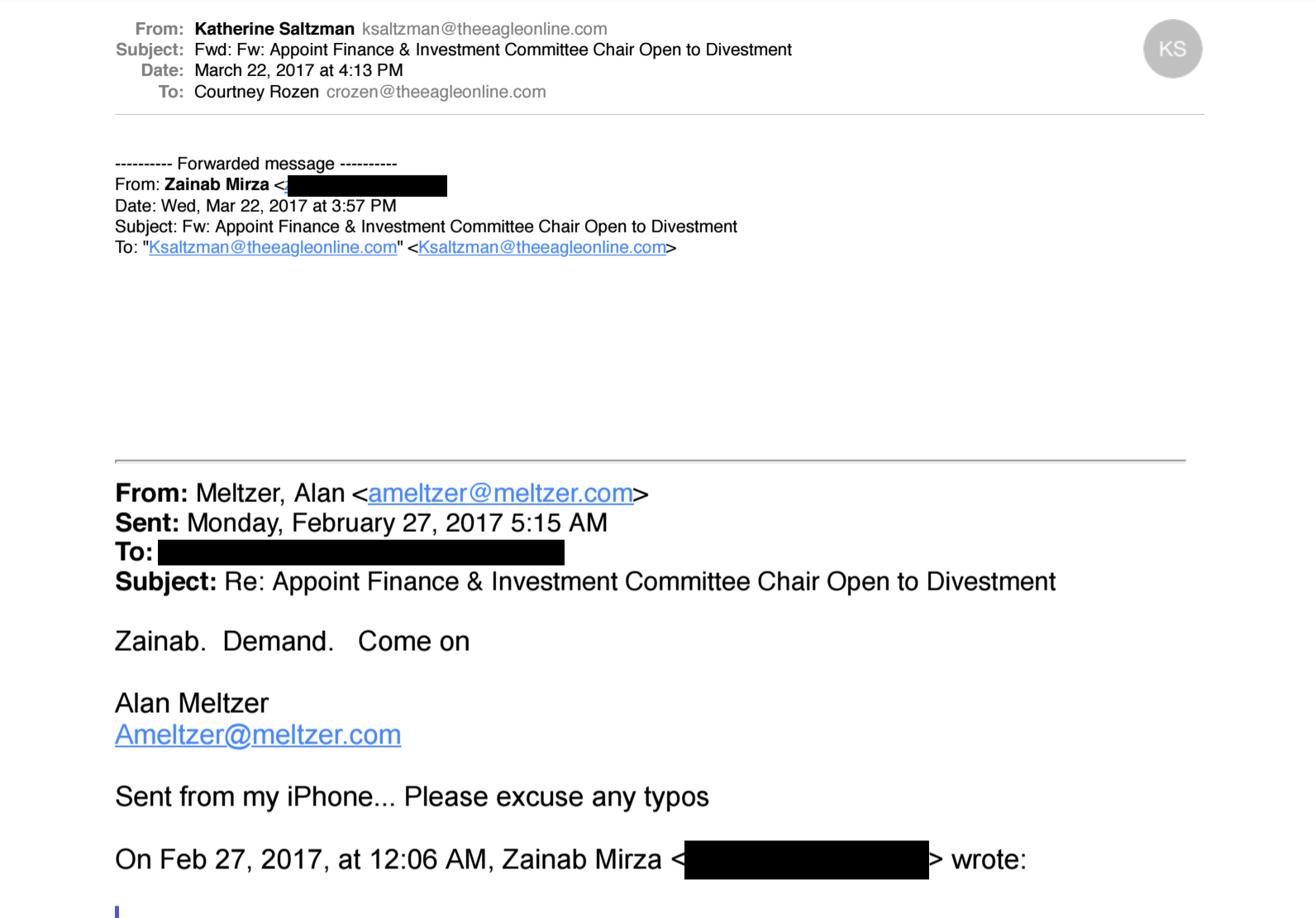 The letters were sent to several individual trustees’ personal emails, including Meltzer, an AU alum and a member of the Finance and Investment Committee. The Eagle obtained Meltzer’s response to six students who emailed him about the petition.