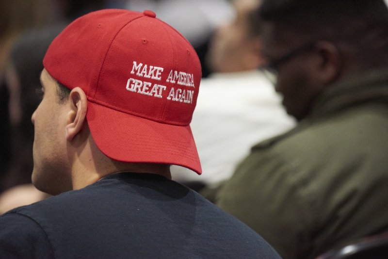 Students and non-AU affiliates stood in a line outside of Kerwin Hall on Nov. 7, waiting to hear D’Souza speak on “fake history” in President Donald Trump’s America. Make America Great Again hats and Trump regalia were donned by multiple audience members. One student, who declined to be named, said that this was the only time he felt comfortable wearing his Trump shirt because “it’s just not worth getting into fights with liberals at AU.”