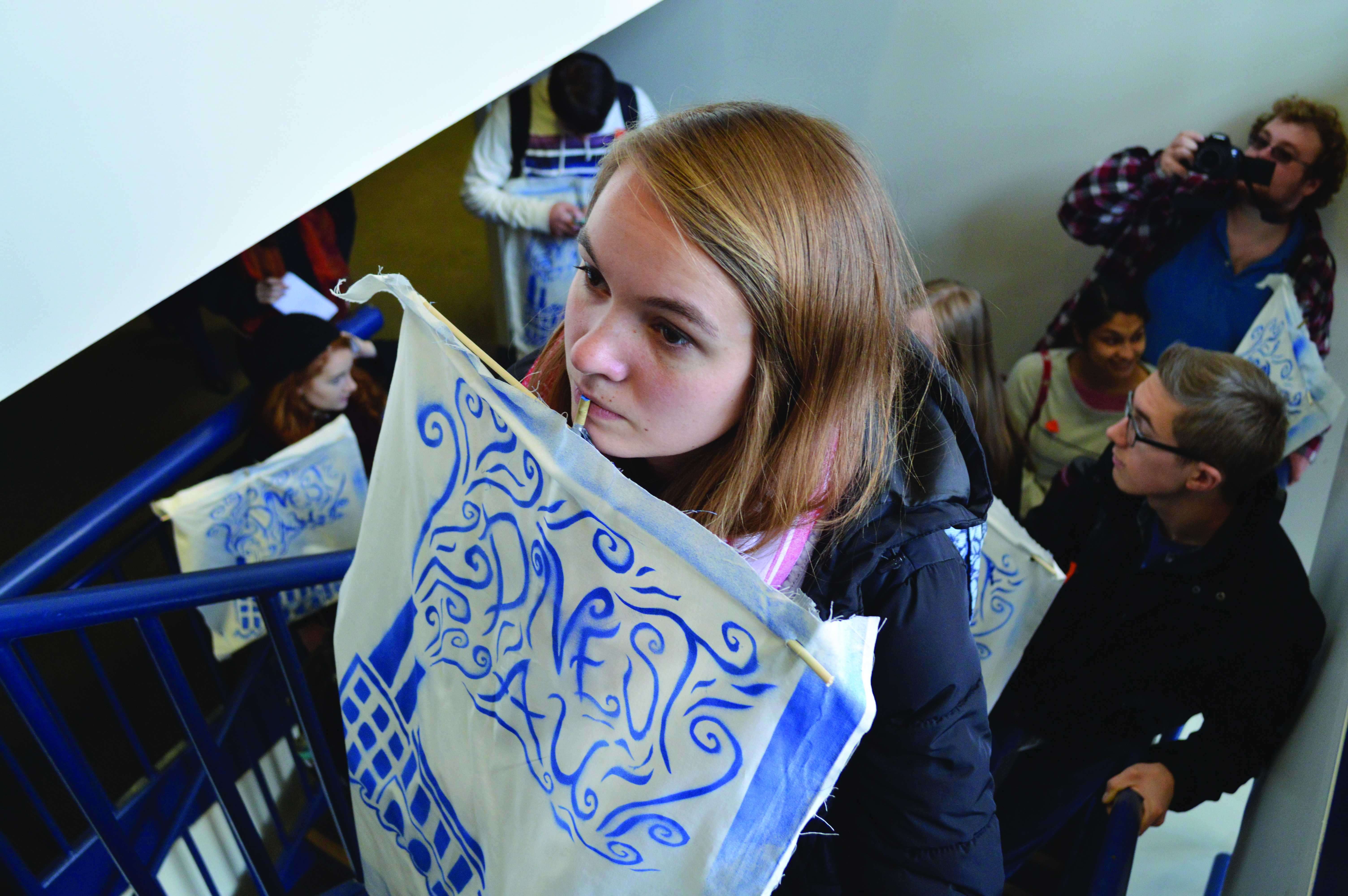 Emily Dalgo and other members of Fossil Free AU march during the finance and investment committee meeting PHOTO: BRYAN PARK/THE EAGLE