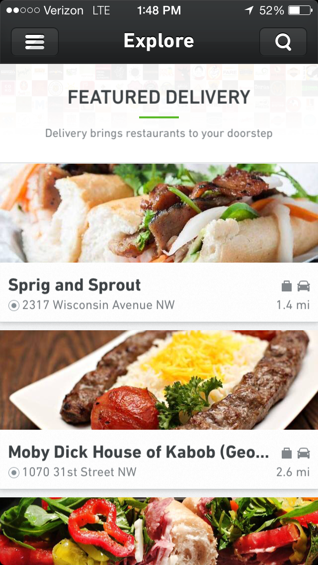 GrubHub is probably the most well-known food delivery app available. Upon downloading the app, you are asked to create an account and from there it is easy to personalize the app to your preferences. You can enter your current location as well as any keywords to instantly find the right place. Since GrubHub is available in over 800 cities, you can use it on campus or at home. Each listed restaurant has a user rating (out of 5 stars) and the distance from your current location.