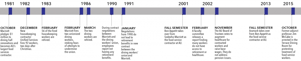 With AU’s dining and housekeeping services, contractors come and go, but workers often stay. New contracts with new companies may mean different benefits for those workers. Since the 1980s, the University has had three different dining contractors, with the longest serving being Marriott Corporation from 1981 to 2001. (After a merger in 1998, the company was known as Sodexho-Marriott for the remainder of its time at AU.) During the Marriott years, workers and workers’ rights activists allege some dining employees stopped receiving full pension benefits. At least 13 current food service workers have been employed since the Marriott era.