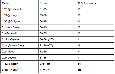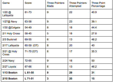 Aside from the win against Holy Cross, which was a defensive slugfest, AU has hit at least six threes in all of its wins. Unfortunately, six may not be enough come tournament time. Eight is a solid benchmark became it is both reasonable and effective. This obviously does not mean AU should abandon its offense and start jacking threes all game. For instance, in the loss against Boston, the Eagles hit nine threes but needed 29 attempts. If this team starts getting hot from three, more driving and cutting lanes will open up as defender move in to help, resulting in a more effective “Princeton Offense.”