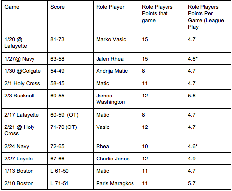 AU’s two leading scorers, senior guard Jesse Reed (13.6 ppg league play) and freshman guard Delante Jones (14.2 ppg league play) must be effective scorers every night for AU to stand a chance in advancing through the tournament. They have both been incredibly consistent for the Eagles down the stretch, and the team will be counting on their abilities in post-season play. While Reed and Jones both need to play well, AU will also need its role players to step up even more and provide additional scoring. Asking two players to carry the offense is too much and will not be successful. Here are how role players have stepped up in each of AU’s wins.