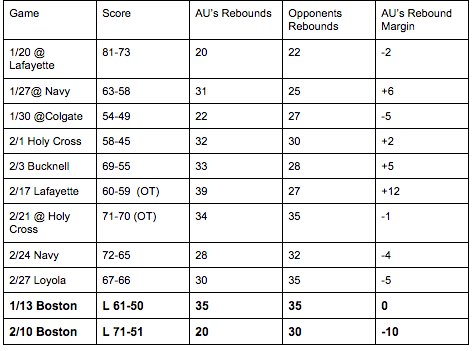 The Eagles have a -3.9 rebound margin per game. In other words, on average teams out-rebound AU by four during a game, and only Holy Cross and Lafayette are worse in the category of rebounds among Patriot League teams. The Eagles don’t necessarily have to win the battle of the boards, but again, they can’t get completely overwhelmed giving up second chance points.