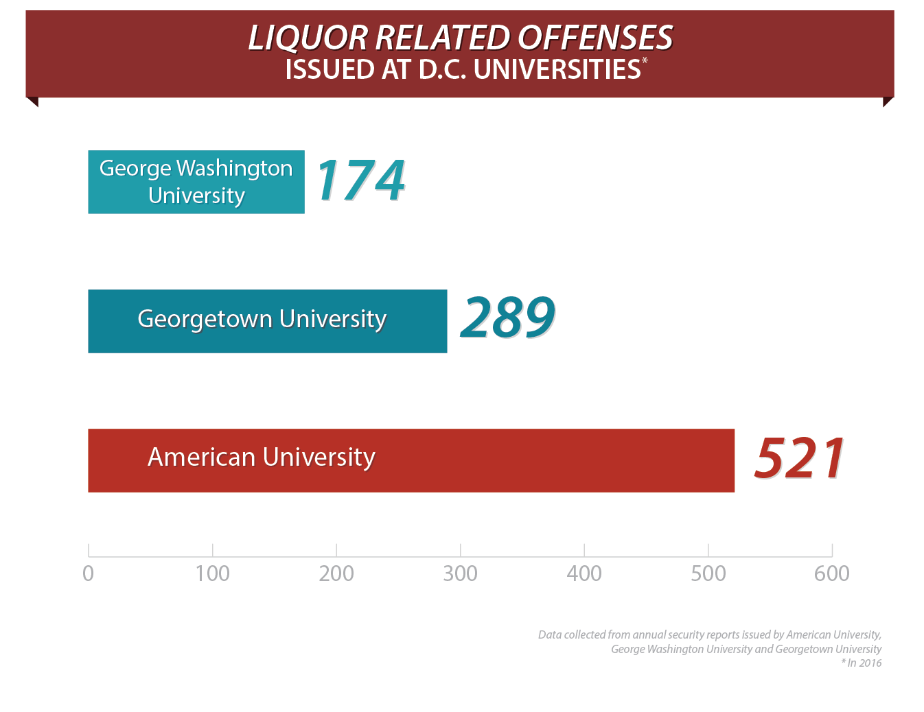 Compared to other D.C. universities, such as George Washington and Georgetown, AU has a much higher total of liquor law violations issued by school police. GW reported 174 liquor law violations on campus in 2016, and Georgetown reported 289 liquor violations on campus property. AU's total is more than GW and Georgetown combined.