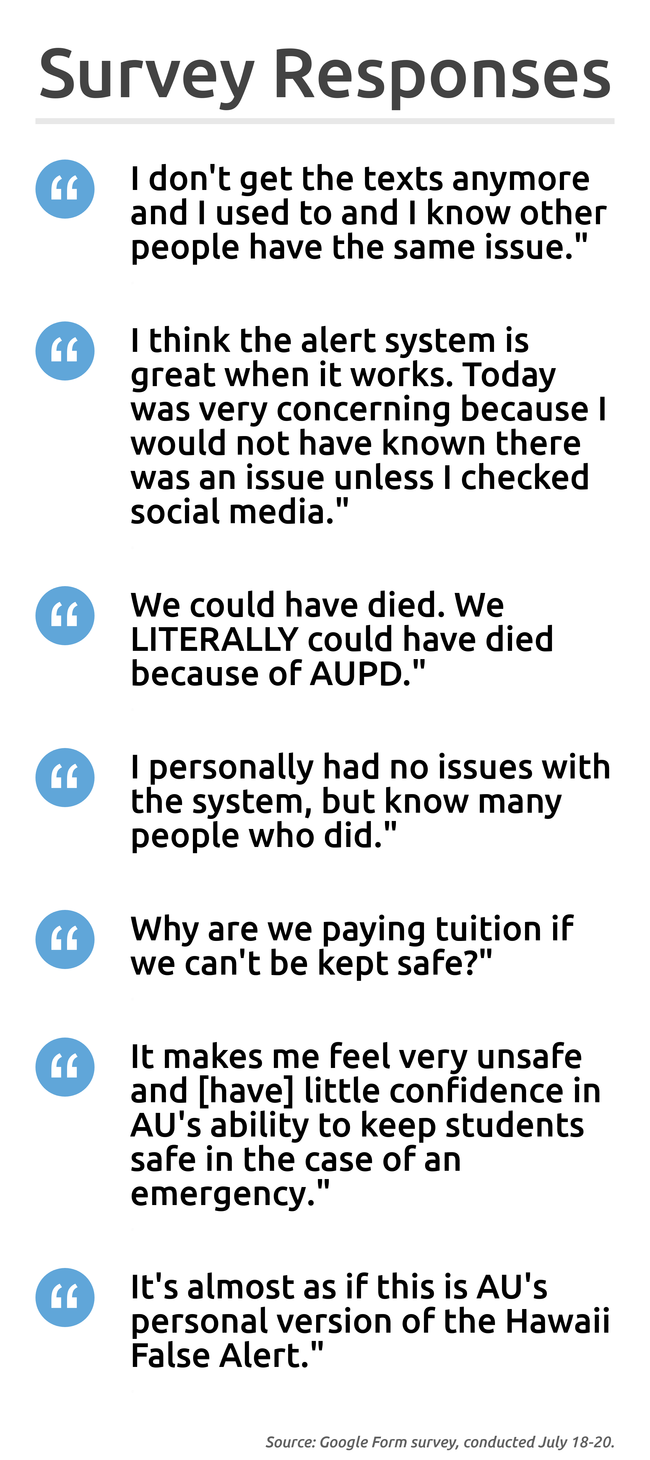 Outrage over the lack of alerts was not limited to undergraduate students. Several students in the Washington College of Law responded to the survey, stating that many of their classmates studying for the bar exam on campus were not informed of the lockdown for several minutes.