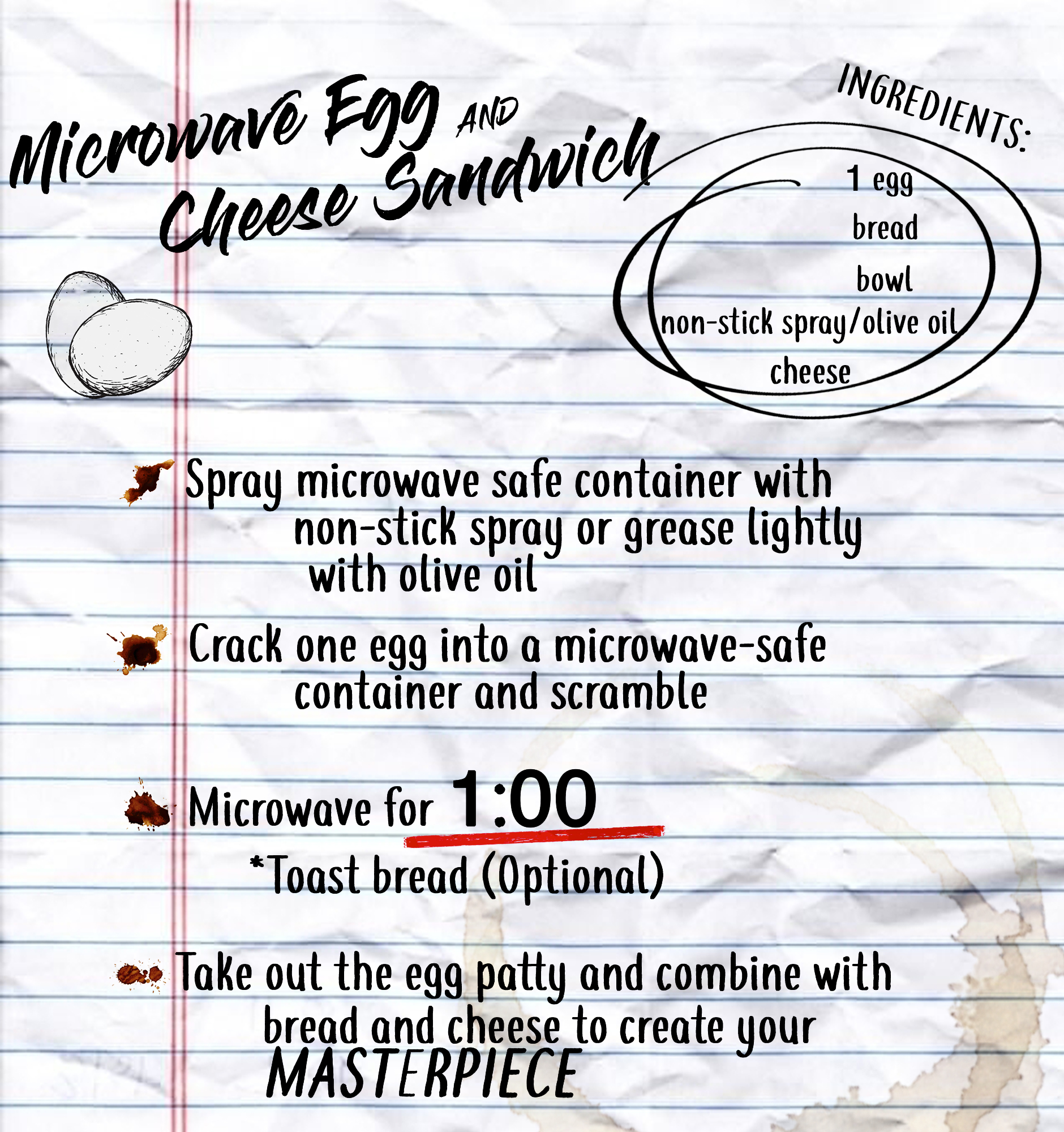 You can never go wrong with an egg sandwich, but when Einstein’s has a wait with an unforeseeable end, it can be agonizing to settle for cereal. Lovers of the breakfast staple can find solace in this classic egg and cheese sandwich redesigned to fit your Microfridge unit and tight morning schedule.