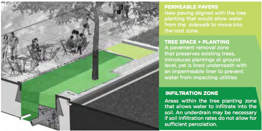 The proposal is highly focused on creating a cohesive streetscape for the area by improving landscaping and creating gathering places along the largely empty Connecticut Avenue sidewalks. Expanded treeboxes serve as an added buffer between pedestrians and traffic and, along with permeable pavement, create a stormwater management system which catches rainwater before it runs off.