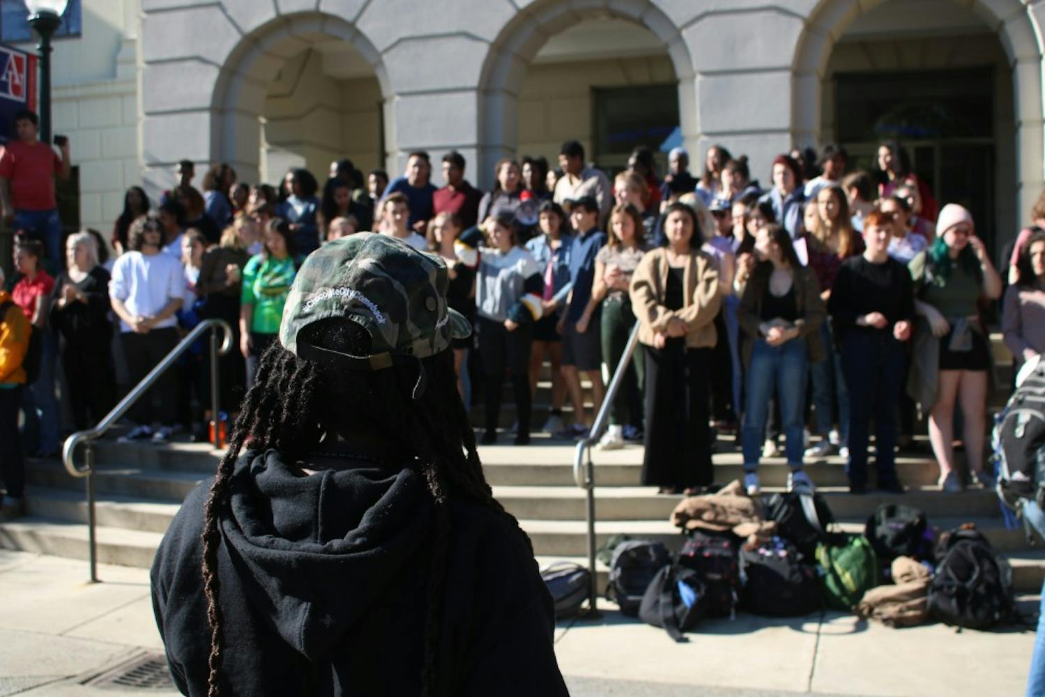 More than 100 students demonstrate outside MGC in support of Gianna Wheeler during her student conduct hearing on Monday.